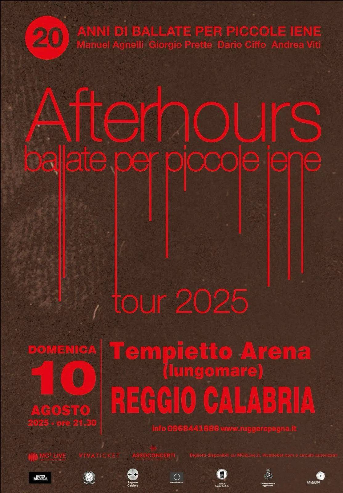 IL TOUR “BALLATE PER PICCOLE IENE”, CHE CELEBRA I 20 ANNI DALLA PUBBLICAZIONE DELL’ICONICO DISCO E LA RISTAMPA IN EDIZIONE SPECIALE IN USCITA IN PRIMAVERA, SARA' ANCHE A REGGIO CALABRIA IL 10 AGOSTO, ORE 21:30. ACQUISTA ORA, BIGLIETTI SU VIVATICKET E TICKETONE  INFO: 0968441888 Per celebrare i 20 anni dall’uscita dell’iconico album Ballate Per Piccole Iene e la ristampa in edizione speciale...