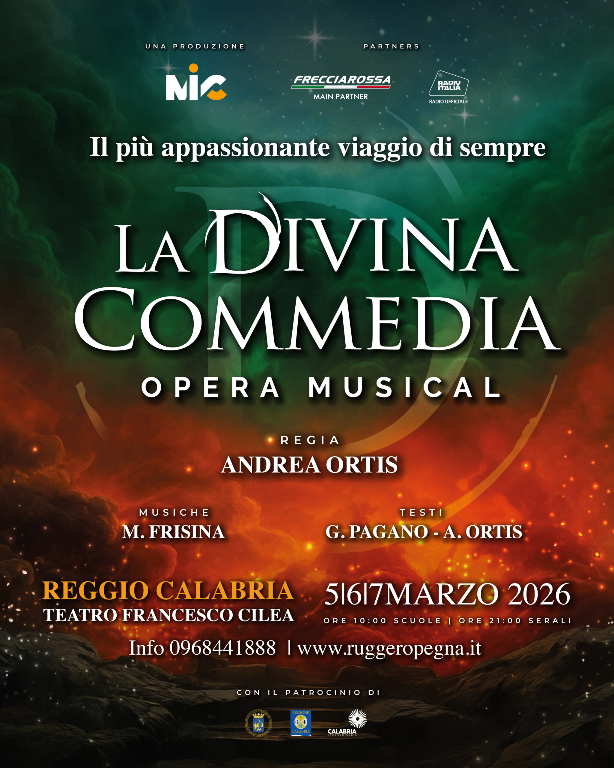 Il colossal La Divina Commedia Opera Musical sarà in scena dal 5 al 7 marzo 2026 al Teatro Francesco Cilea di Reggio per l’unica tappa in Calabria. Esauriti i matinée per le scuole, prosegue la prevendita per gli spettacoli serali delle ore 21:00, online su ticketone.it e nei punti autorizzati (Reggio C.: B'art, a fianco...
