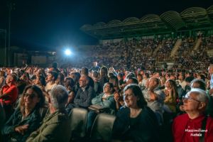 Uno spettacolo eccezionale durato oltre due ore, durante le quali Luca Medici, vero nome del comico pugliese, ha sfoderato tutte le sue doti di artista unico nella storia dello spettacolo italiano, mettendo insieme alla sua indiscutibile verve di attore comico anche qualità e abilità di musicista, cantante, imitatore. Un talento completo, capace di incantare con un carisma e una simpatia che arrivano a tutti. Con questo show, qualora ce ne fosse bisogno, Checco Zalone ha confermato anche a Lamezia di non essere solamente autore e attore di film da super incassi ma artista vero, che supera l’esame della prova dal vivo con la lode tradotta in continui applausi, risate, esplosioni di gioia, fino alla lunga standing ovation finale di un pubblico entusiasta, consapevole di aver vissuto una serata magica. Con la sua ironia sempre intelligente e pungente, mai banale, ha trascinato tutti in quella che si può ben definire la “Commedia alla Zalone”, un mix perfetto di tagliente e spiazzante umorismo, tra recitazione dal tratto spontaneo e performance tirate fuori dal suo vastissimo bagaglio di capacità artistiche e bravura. Dal cinema al live, il nuovo salto sulla prova inappellabile del palcoscenico più difficile ha dimostrato la maturità assoluta di un attore fine e completo, amato da ogni target e fascia d’età, come ha dimostrato il pubblico di ieri sera, letteralmente contagiato d’allegria. Il feeling tra lui e il suo pubblico è stato immediato, già dall’arrivo sul palco, raggiunto a sorpresa dal fondo della platea gremita, accolto da un sonoro boato. Il calore subito avvertito dall’artista, lo ha spinto perfino ad allungare la scaletta e regalare alcuni esilaranti fuori programma alle migliaia di spettatori, arrivati da ogni angolo della regione, che hanno riempito platea e tribune di uno stadio trasformato in un vero teatro sotto le stelle.