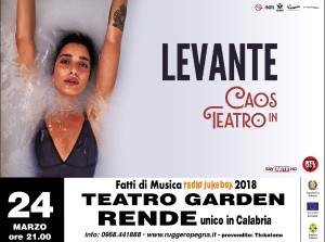 Il nuovo fenomeno della musica d’autore italiana sarà in concerto con la sua band il 24 marzo alle ore 21.00 al Teatro Garden di Rende (Cosenza), unica tappa in Calabria del suo tour “Caos in Teatro“. Biglietti, compreso prevendita, euro 34 platea e distinti, euro 28 galleria, euro 22 galleria 2, in vendita in tutti i punti Ticketone. Per informazioni tel. 0968441888.