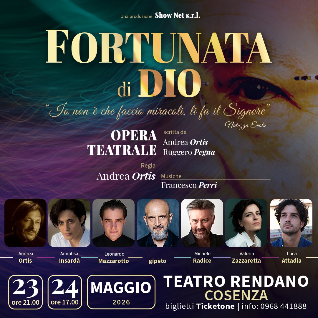Prosegue il lavoro di autori, tecnici e attori, per Fortunata di Dio, l’opera teatrale sulla vita della mistica calabrese Natuzza Evolo, che andrà in scena in prima assoluta i prossimi 23 maggio alle ore 21:00 e 24 maggio alle ore 17 al Teatro Rendano di Cosenza. Scritta da Ruggero Pegna e Andrea Ortis, rispettivamente anche produttore e regista dell’Opera, ha le musiche originali del compositore Francesco Perri, le scenografie di Lele Moreschi, luci ed effetti speciali di Virginio Levrio, la consulenza di Gianmario Pagano. Un team creativo di prim’ordine, a cominciare da Andrea Ortis, che ha già firmato opere di successo come La Divina Commedia Opera Musical, Van Gogh Cafè, Frida. Di primissimo piano è anche il cast, con l’attrice di origine calabrese Annalisa Insardà nel ruolo di Natuzza Evolo e, nei panni dei vari personaggi della sceneggiatura, lo stesso Ortis, Leonardo Mazzarotto, gipeto, Michele Radice, valeria Zazzaretta e Luca Attadia