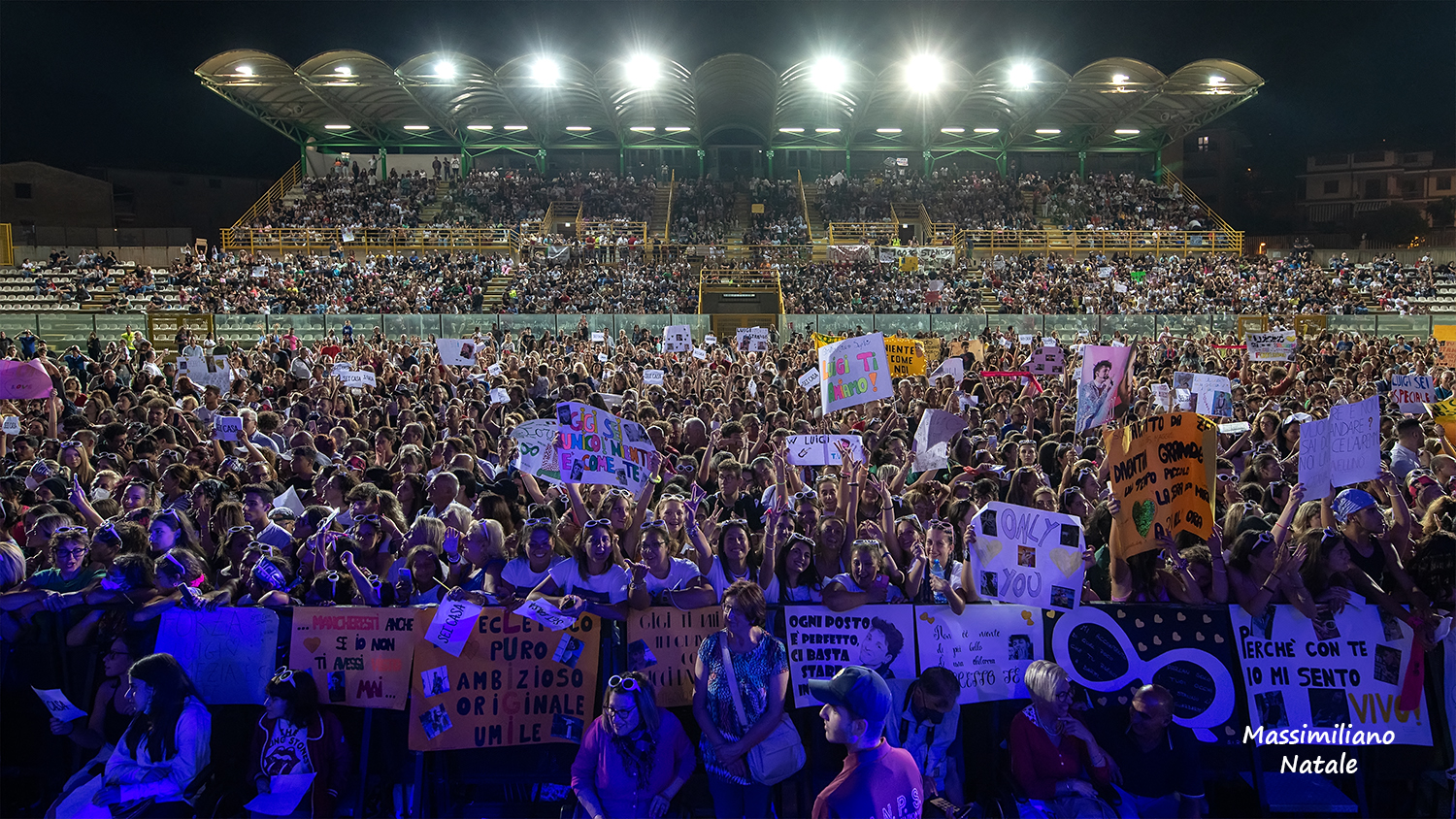 Immediata l’esplosione del pubblico che ha gremito le tribune e il rettangolo di gioco. Urla, applausi, ovazioni, lucine, con un corredo di cartelloni, striscioni, vere e proprie coreografie con fogli di carta colorata, hanno scandito l’intero concerto, fino al doppio bis finale. Felice di questo ritorno, in quella che ha definito la sua “casa”, Luigi Strangis non si è risparmiato, fino a lanciarsi perfino giù dal palco tra le prime file di fan in delirio. Finalmente dal vivo, ha confermato tutta la sua bravura e il meritato successo, eseguendo i brani tratti dal suo primo lavoro discografico “Strangis”, che ha debuttato al primo posto della classifica italiana, e le sue tante hit. Uno dietro l’altro sono arrivati i suoi già numerosi successi, da “Vivo”, brano che gli ha regalato l’ingresso ad “Amici”, a “Muro”, “Partirò da zero”, “Tondo” e “Tienimi stanotte”, disco d’oro e hit dell’estate. Diverse anche le cover, eseguite con la sua splendida voce e ottimi arrangiamenti: da “Eppur mi son scordato di te” della Formula 3, a “Rumore” di Raffaella Carrà (incluso nel suo Ep), fino alla conclusiva “Purple Rain”, che ha incantato nonostante l’audace accostamento con un mito della musica mondiale. A fine concerto, foto e autografi fino a tarda notte a piccoli e grandi fan che hanno circondato il backstage. Va in archivio così una notte straordinaria piena di “fatti di musica” da ricordare.